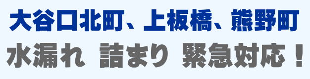 大谷口北町、上板橋、熊野町での水の困った即解決!急な水道トラブルに緊急でかけつけ訪問し、蛇口の水漏れ、トイレ詰まり、排水の溢れ、タンクの故障など修理いたします。